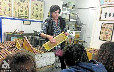 Durante la visita guiada, Isabel explica el funcionamiento de las colmenas, los utensilios tradicionales de la apicultura y el proceso natural de elaboración de la miel.